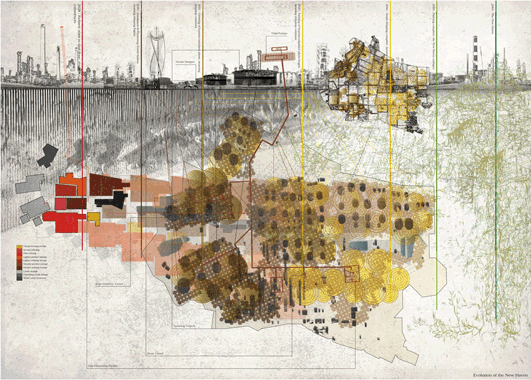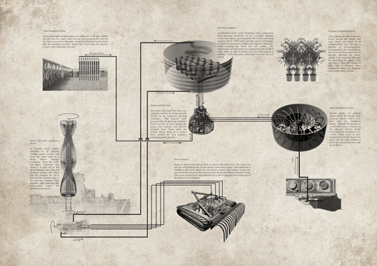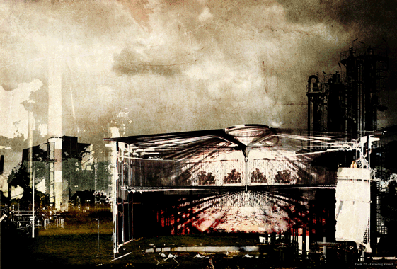 Through the implementation of a Pioneering Vessel System in 2030, the project highlights a remediation avenue which initiates the longer term solution of converting the Texaco Oil Refinery in Milford Haven, Wales into a “New Haven”. The connected Vessels, which inhabit the redundant infrastructure of the refinery, utilise physical steam extraction, bioremediation and phytoremediation to cleanse the soil of toxins. This system allows the infrastructure of the refinery to remain, showing how it could be adapted and reconfigured into a new landscape that offers more than merely an industrial museum to fossil fuels.