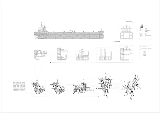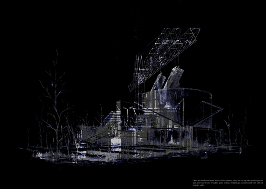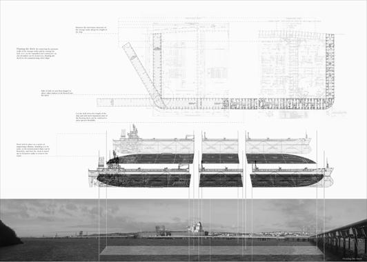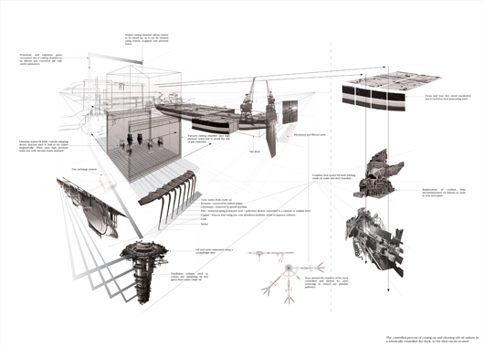 Designed as floating dock the ‘Tanker Slicer’ incorporates the reconfigured hull of a super tanker and water jet cutting technology to dissect redundant oil tankers into sections that can be more easily transported onto dry land, for further re-cycling.